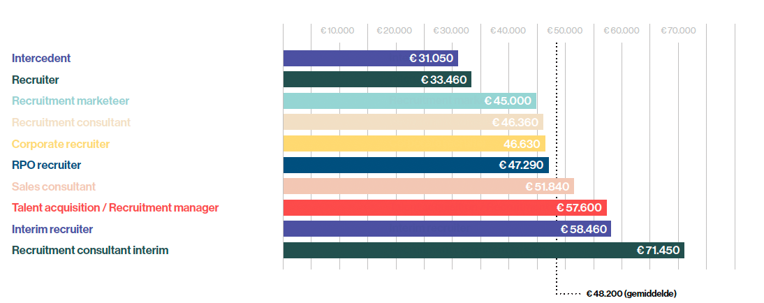 Hier wordt het al een stuk interessanter als het gaat om het doen van een passend aanbod. De twee meest populaire recruitment functies in Nederland, corporate recruiter en recruitment consultant, liggen erg dicht bij elkaar met een gemiddeld salaris van iets meer dan €46.360 op jaarbasis. Vervul je een managementfunctie binnen één van deze twee rollen? Dan kan je daar nog eens iets meer dan €10.000 euro bovenop gooien.