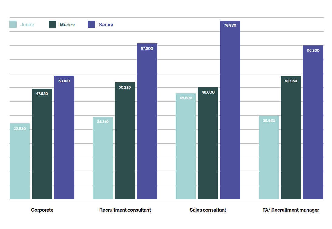 Wil je een passend aanbod doen, is niet alleen de functie van een recruiter belangrijk, maar ook de hoeveelheid ervaring waar iemand over beschikt. Waar het gemiddelde salaris van een corporate recruiter en recruitment consultant vrijwel gelijk waren, is dit voor een senior corporate recruiter en senior recruitment consultant niet meer het geval. Een senior recruitment consultant verdient namelijk bijna €14.000 meer op jaarbasis dan een senior corporate recruiter.
